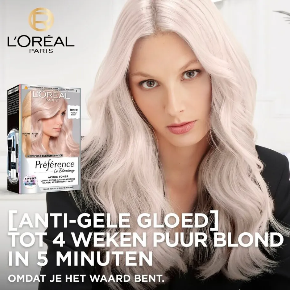 De L’Oréal Paris Préférence Le Blonding Pearly Boost Acidic Toner is een toner die ongewenste oranje en gele tonen effectief neutraliseert voor een ultra puur blond resultaat dat lang houdt dankzij de ammoniakvrije technologie.