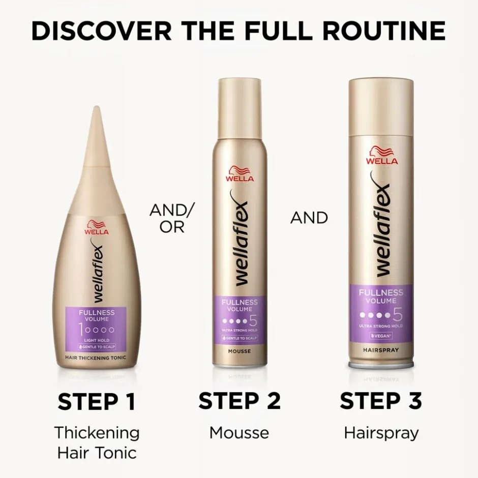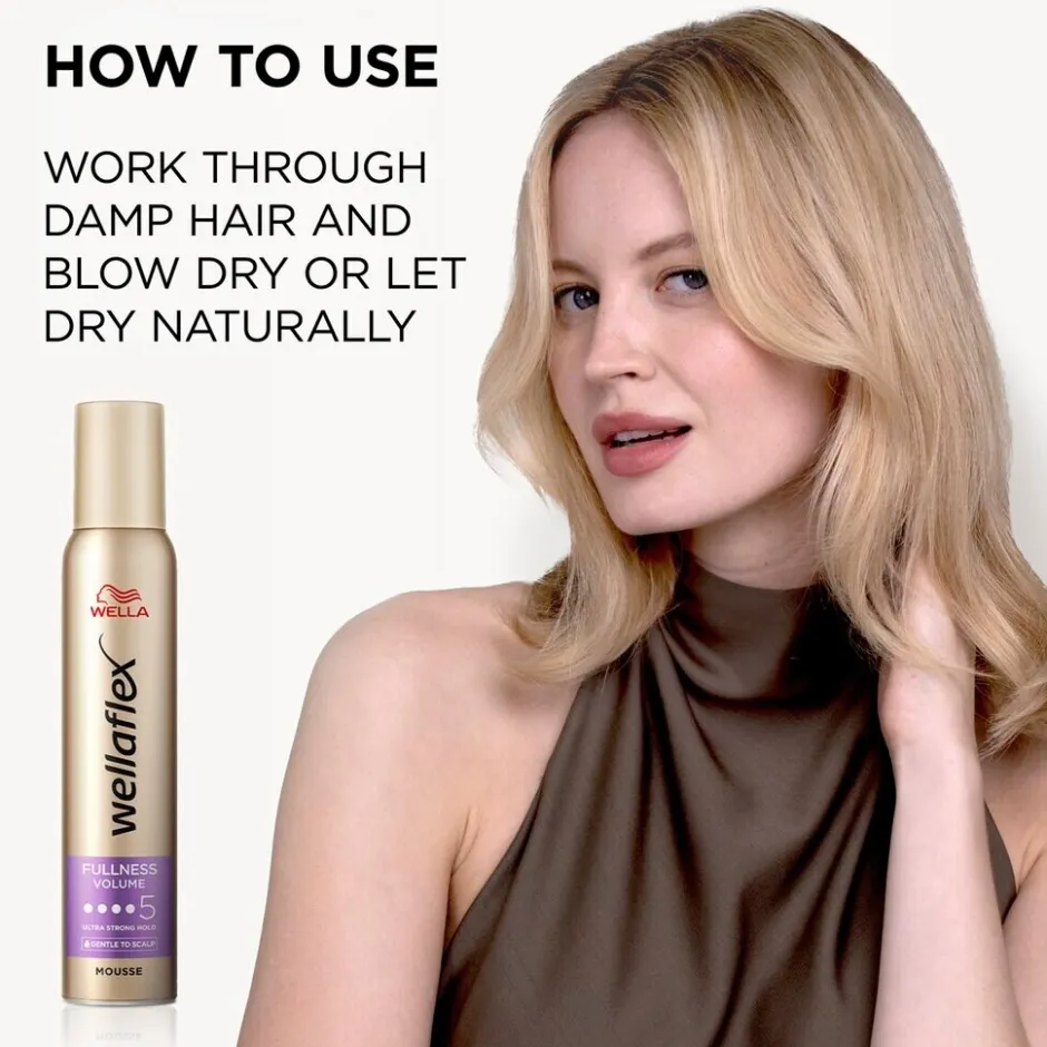 Word verliefd op zacht en volumineus haar zonder plakkerige restjes, dankzij de Wella Wellaflex Fullness Volume Hold 5 Mousse voor fijn en plat haar.
