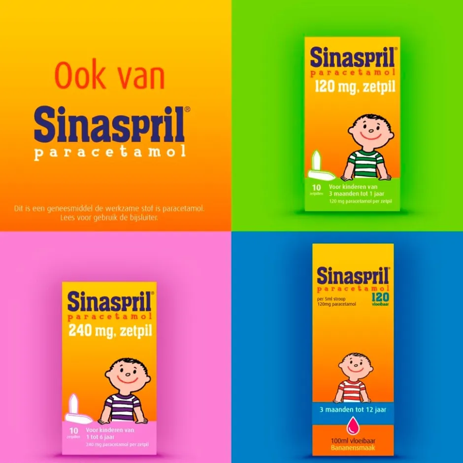 Sinaspril Paracetamol 120mg Kauwtabletten kan je al gebruiken bij kindjes vanaf 3 maanden. Voor als je kindje last heeft van koorts en pijn bij griep en verkoudheid, koorts en pijn na vaccinatie of hoofdpijn.