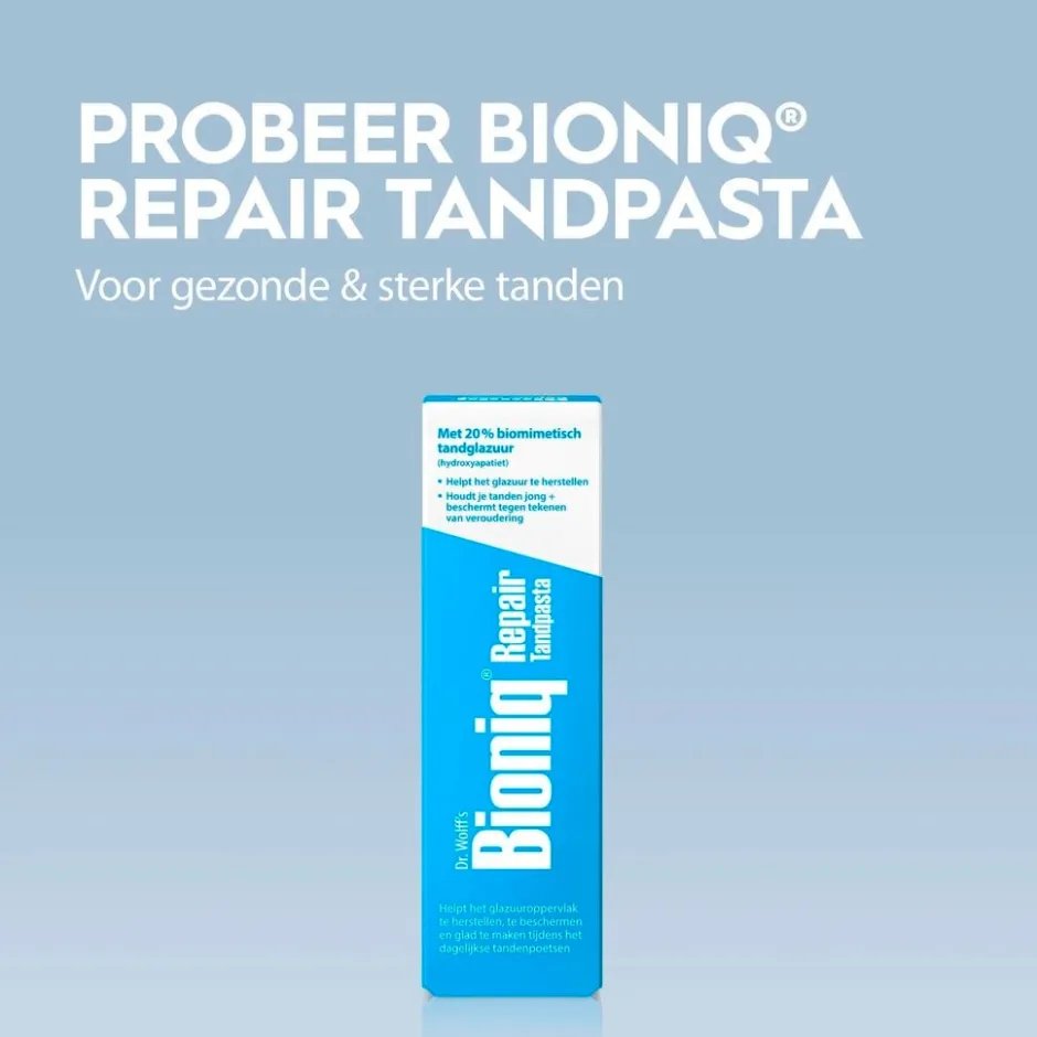 Bioniq Repair Tandpasta met 20% biomimetisch tandglazuur (hydroxyapatiet) helpt het glazuur te herstellen, houdt je tanden jong en beschermt tegen tekenen van veroudering.