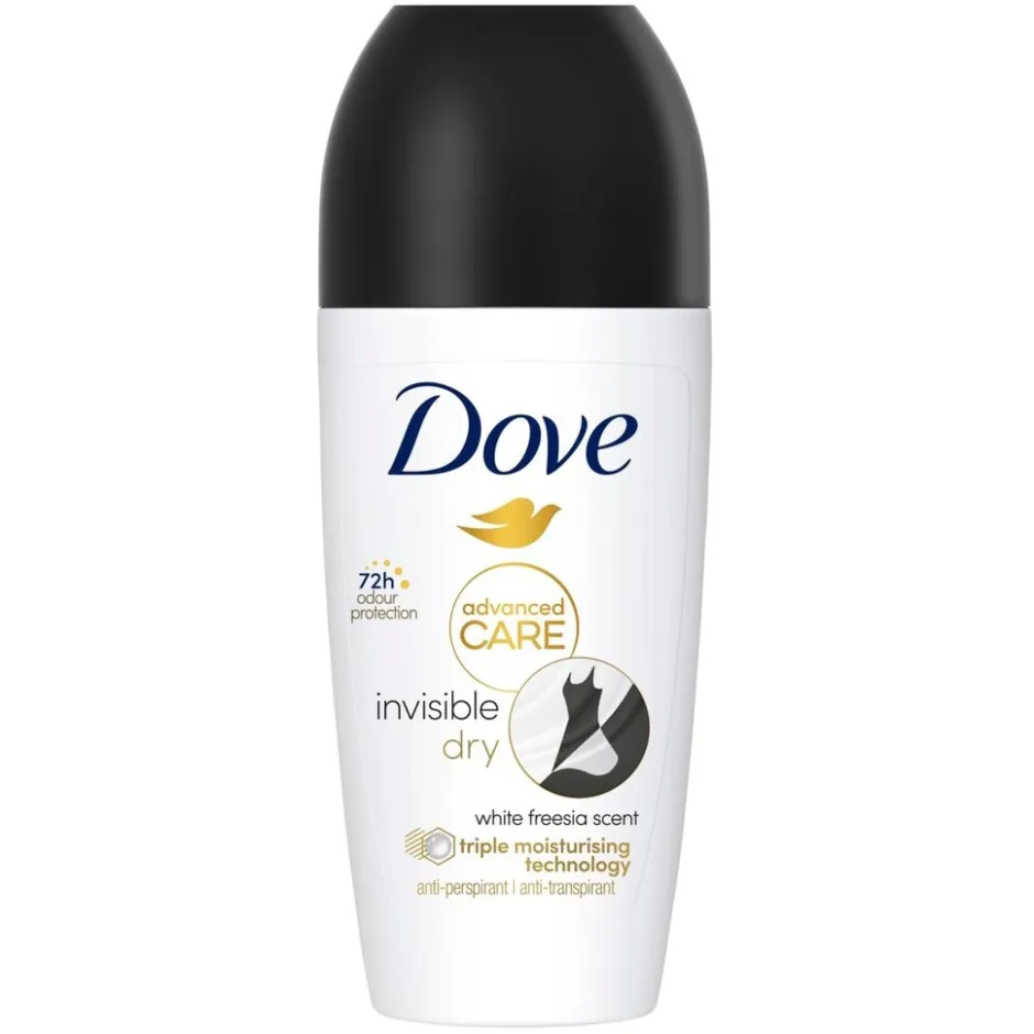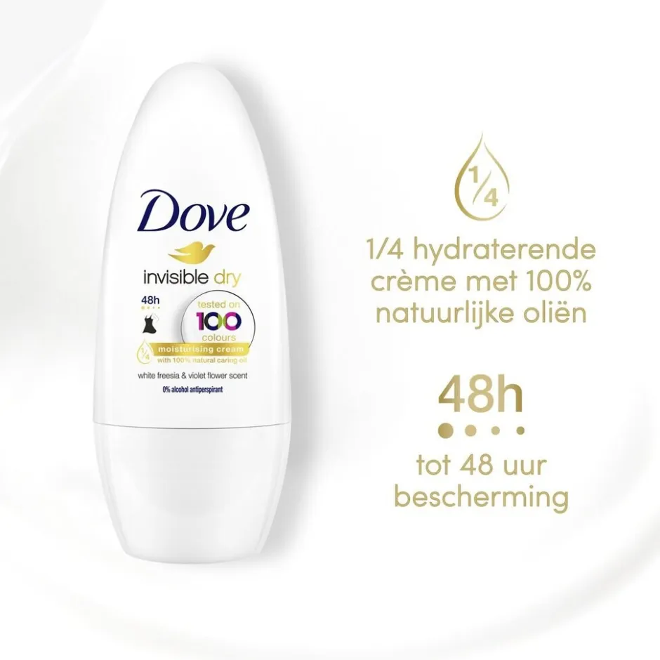 Dove Invisible Dry Antitranspirant Deodorant Roller beschermt zowel je oksels als je kleding.