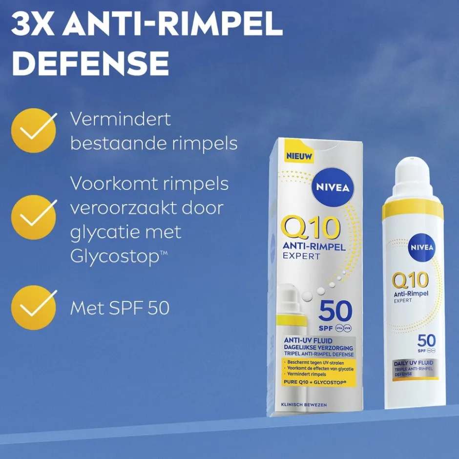De voordelen van de NIVEA Q10 Anti-Rimpel Expert SPF50 Anti-Uv Fluïde: