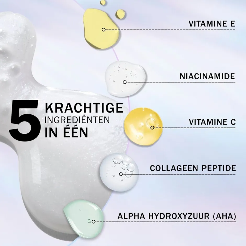 De geconcentreerde huidverzorgingsformule is supercharged met vijf krachtige ingrediënten: niacinamide, vitamine C, collageenpeptide, vitamine E en alfahydroxyzuur (Aha).