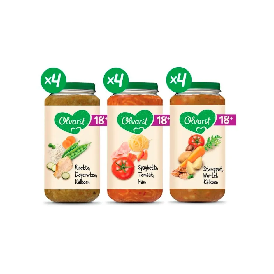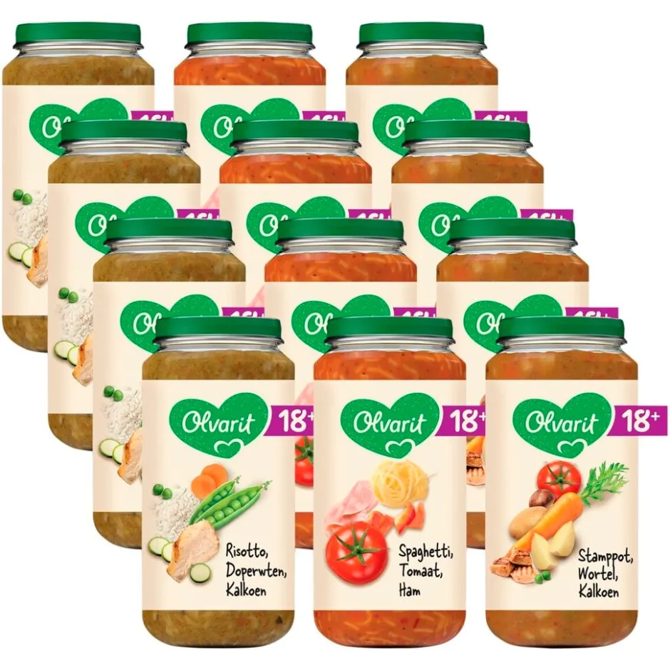 Het Olvarit 18+M Maaltijd Variatiemenu bevat drie smaken babyvoeding. De babyhapjes met pure en natuurlijke ingrediënten voor baby’s vanaf 18 maanden hebben een herkenbare smaak en textuur die bijdragen aan de smaakontwikkeling.
