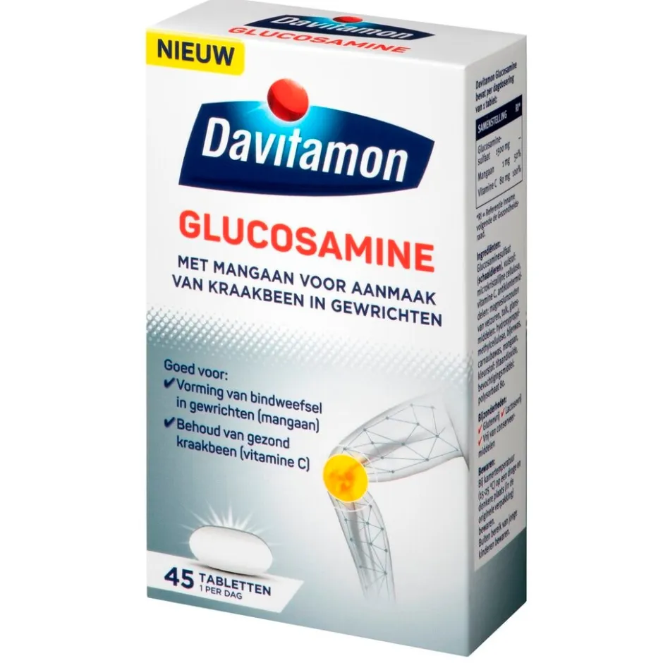 Davitamon Glucosamine Tabletten bevatten mangaan en vitamine C. Vitamine C is goed voor behoud van gezond kraakbeen. Mangaan draagt bij aan de normale vorming van bindweefsel onder andere in de knieën, heupen, ellebogen en vingers.