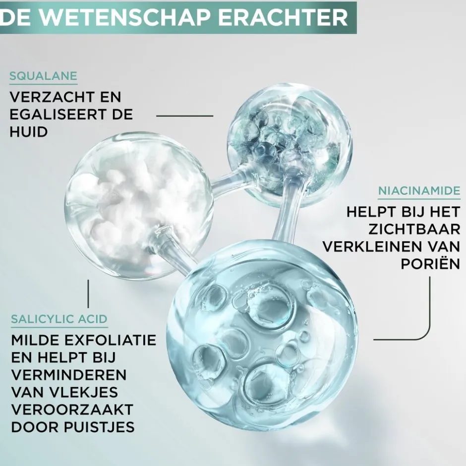 Garnier PureActive Salicylic Exfoliërende Liquid Care helpt bij het verminderen van vlekjes veroorzaakt door puistjes, egaliseert je teint en helpt bij het verminderen van de zichtbaarheid van poriën*.