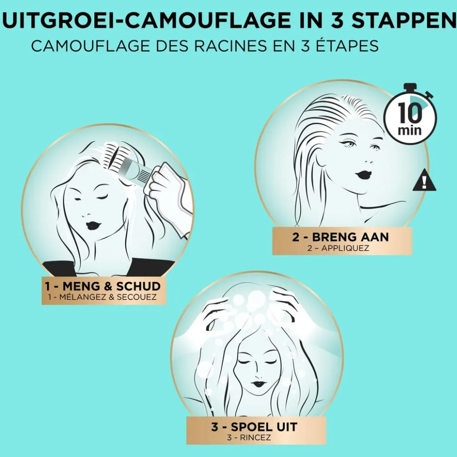 Na het kleuren geniet je van een natuurlijk kleurresultaat. De haarkleuring mengt met je huidige haarkleur, waardoor de kleur goed aansluit en natuurlijk oogt. Eenmaal gedekt, blijft je uitgroei tot vier weken gecamoufleerd.
