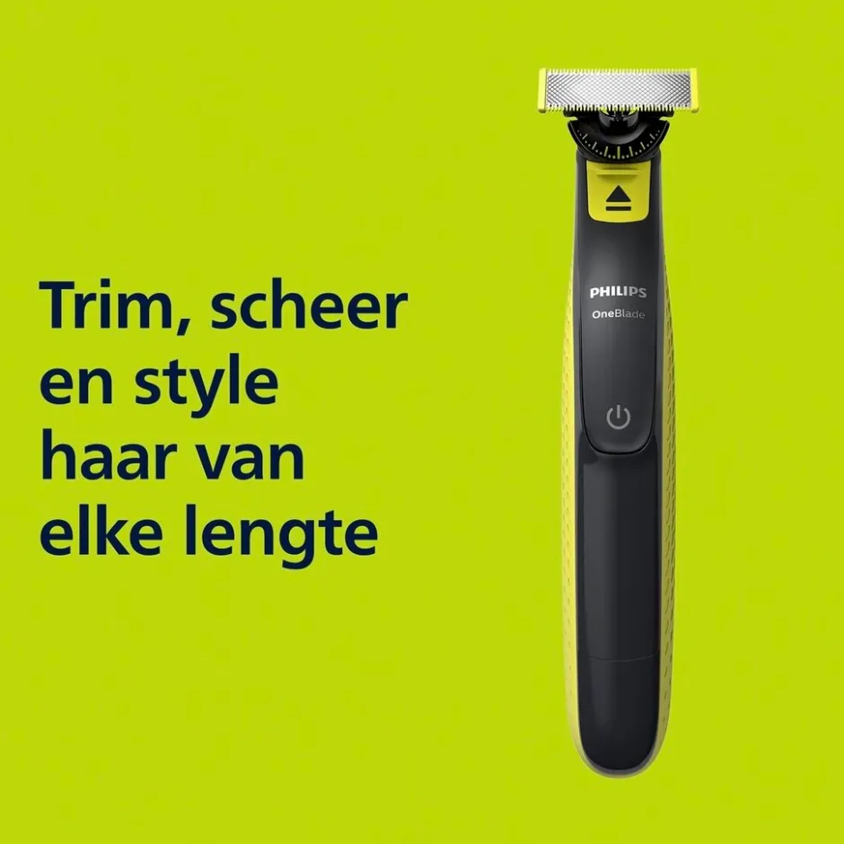 Het OneBlade-mesje met dubbel beschermingssysteem, een gladde coating en afgeronde uiteinden, beweegt 12000 keer per minuut, voor een effectieve en comfortabele trim- of scheerbeurt.