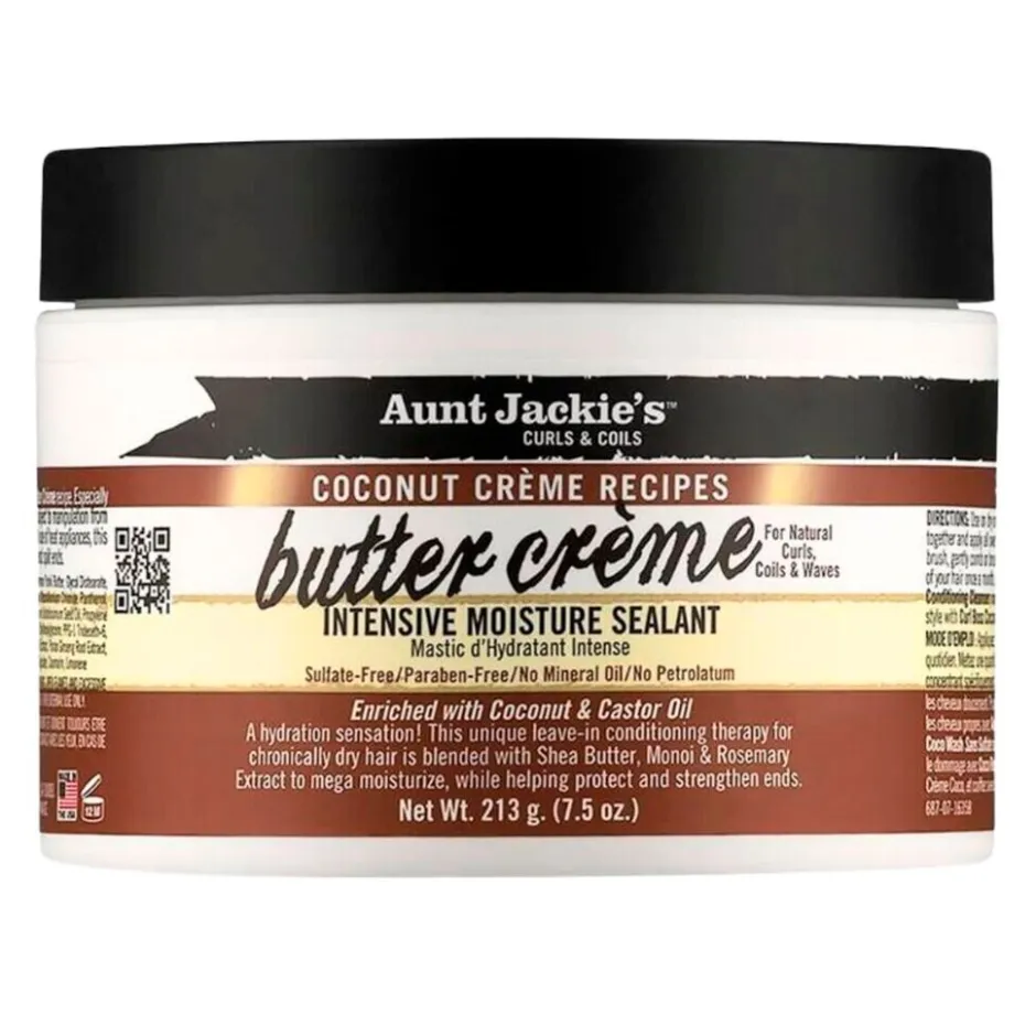 Aunt Jackie’s Curls & Coils Coconut Crème Recipes Butter Crème Intensive Moisture Sealant is vooral geschikt voor beschermende kapsels (zoals haar onder pruiken, weaves en vlechten). Het oliemengsel helpt gespleten haarpunten te behandelen en te voorkomen.