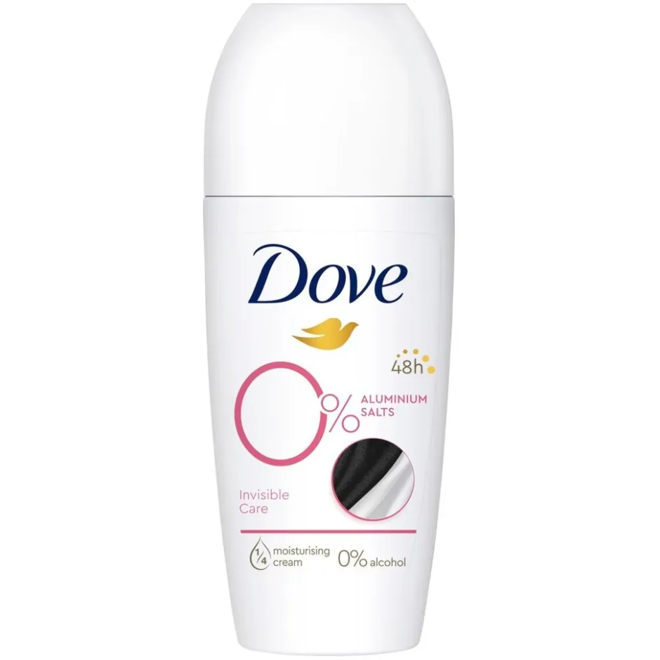 Dove Invisible Care 0% Deodorant Roller met 1/4 hydraterende crème en 0% alcohol beschermt zowel je oksels als je kleding.