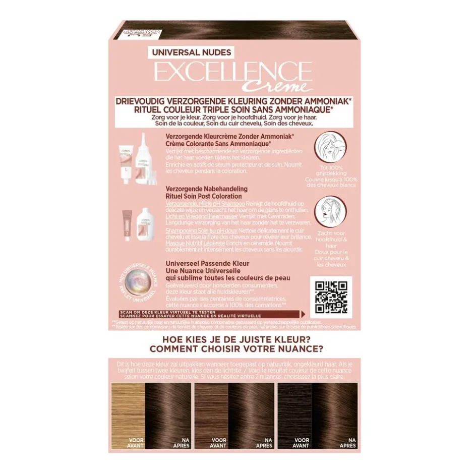 L’Oréal Paris Excellence Universal 5U Nudes Lichtbruin Permanente Haarverf is een crèmekleuring zonder ammoniak die tot 100% grijsdekking biedt.