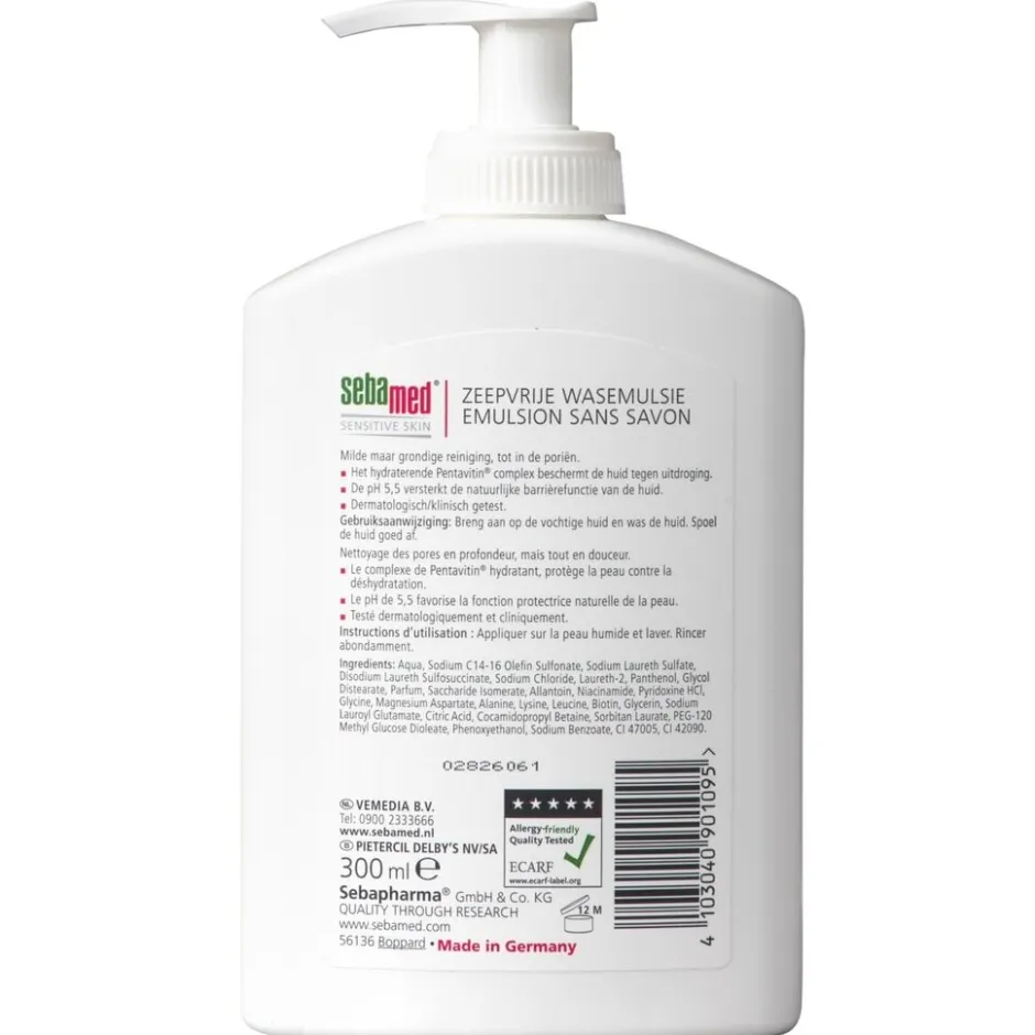 • De milde, wasactieve bestanddelen van sebamed zeepvrije wasemulsie reinigen de huid zeer grondig. Pentavitin en allantoïne beschermen de huid tegen uitdrogen. De huid voelt merkbaar zacht en soepel aan