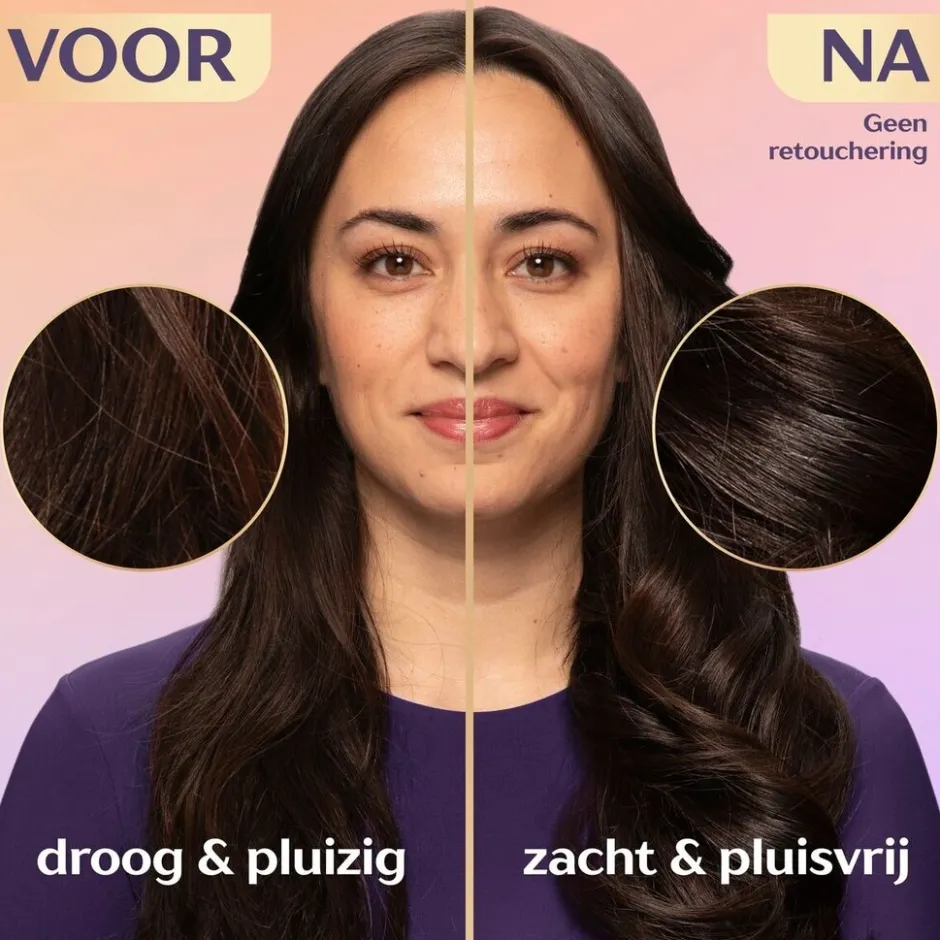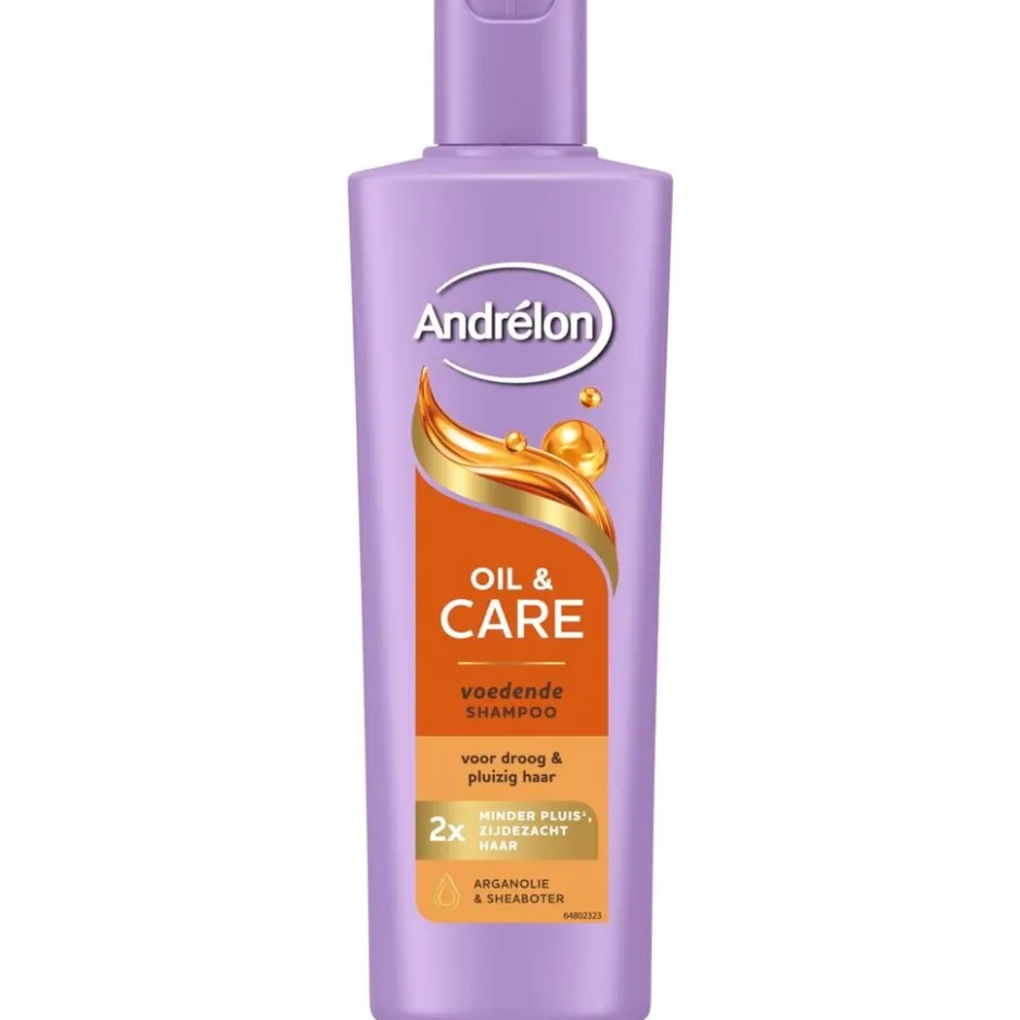 De Andrélon Oil & Care Voedende Shampoo, verrijkt met arganolie en sheaboter, voedt droog en pluizig haar intensief voor twee keer minder pluis* zonder je haar te verzwaren.