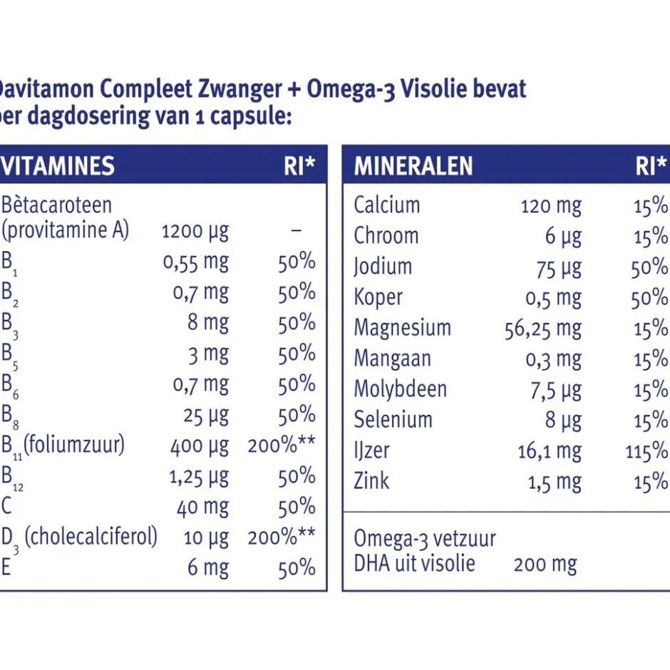 Suikervrij;Claimbeschrijving|¹Goed voor de ontwikkeling van de hersenen en het gezichtsvermogen van de baby*** Omega-3 verzuur DHA. ²Goed voor de ontwikkeling van de baby Foliumzuur (vitamine B11).³Goed voor de weerstand Bètacaroteen, vitamine B6, B11, B12, C, D, koper, selenium, ijzer en zink. ⁴Goed voor het energieniveau Vitamine B1, B2, B3, B5, B6, B8, B12, calcium, jodium, koper, magnesium, mangaan en ijzer. Goed voor de vruchtbaarheid Zink. Goed voor de vorming van de placenta Foliumzuur (Vitamine B11).Draagt bij aan de vorming van rode bloedcellen Vitamine B6, B11, B12 en ijzer.Goed voor het ijzergehalte in het bloed Bètacaroteen, vitamine B2 en C. *** Bij dagelijkse inname van 200 mg DHA in aanvulling op de aanbevolen dagelijkse hoeveelheid voor omega-3 vetzuren voor volwassenen (250mg DHA en EPA).