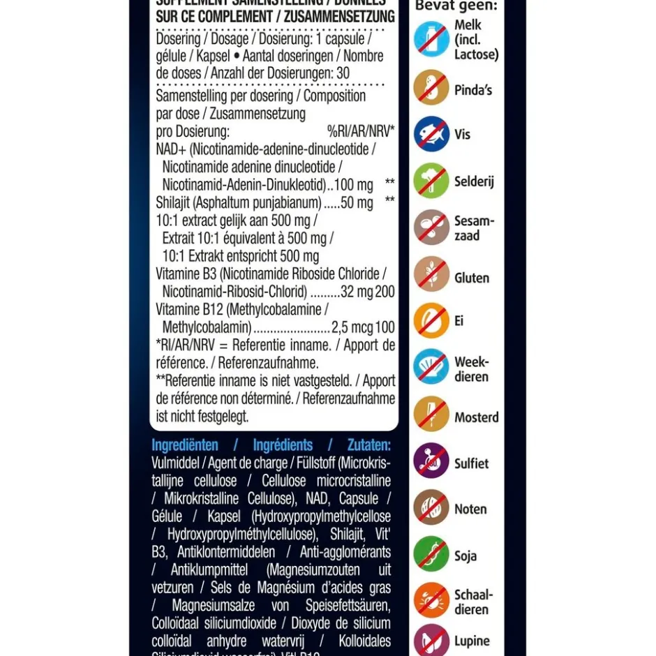 Vitamine B12 draagt bij aan het proces voorcelvernieuwing en speelt een belangrijke rol inhet zenuwstelsel. Dit product bevat ookShilajit, helpt te beschermen bij veroudering,is goed voor de vetstofwisseling en hetimmuunsysteem. *Vitamine B3 is goed voorhet geheugen, de huid en draagt bij aan hetenergieniveau. *Gezondheidsclaims inafwachting van Europese toelating. Bevatgeen zout. Suikervrij