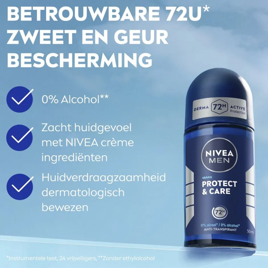Ga voor volledige bescherming en een huid die de hele dag droog en heerlijk zacht aanvoelt. De NIVEA Men Protect & Care Antitranspirant Roller biedt beide in één roller: bescherming en zachte NIVEA verzorging voor je oksels.