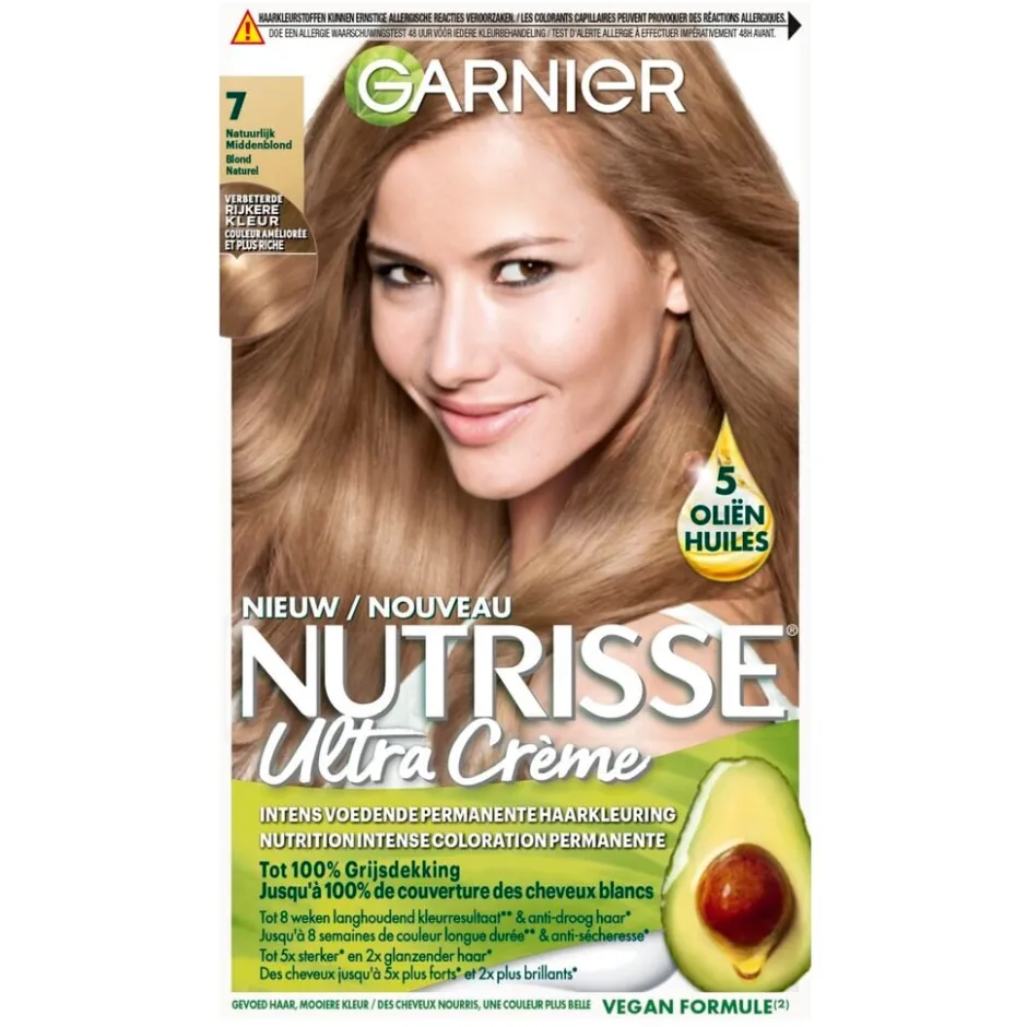Garnier Nutrisse Ultra Crème 7 Natuurlijk Blond Intens Voedende Permanente Haarkleuring is een intens voedende, permanente haarverf die tot 100% grijsdekking biedt, voor een rijk, stralend en langdurig kleurresultaat.