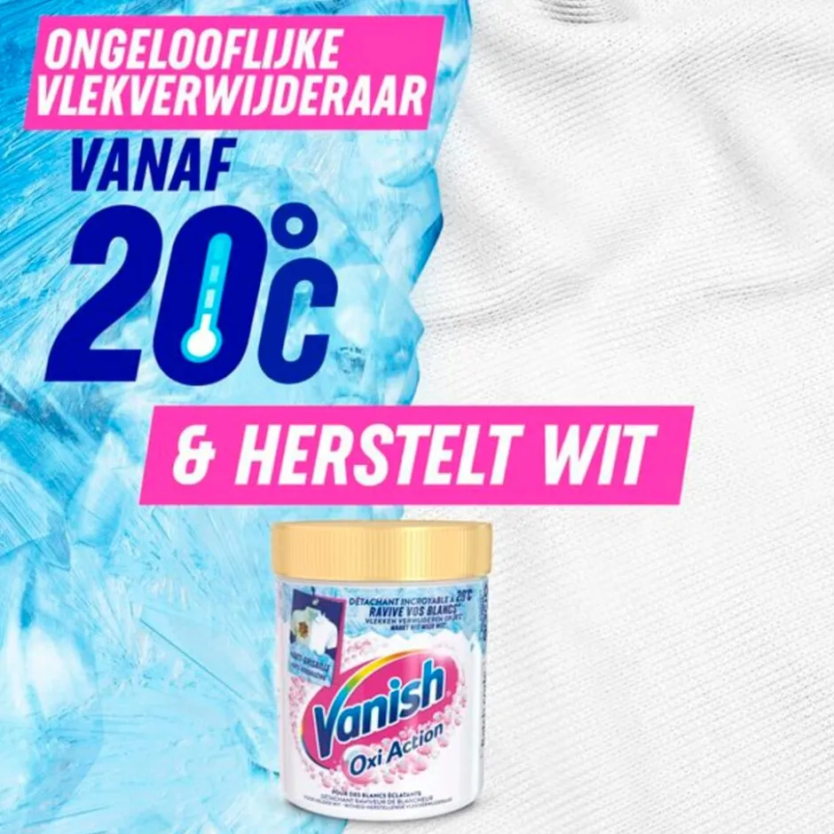 De formule van Vanish Oxi Action Vlekverwijderaar Poeder herstelt je witte was in extreme omstandigheden, bij 20°C en in korte cycli!