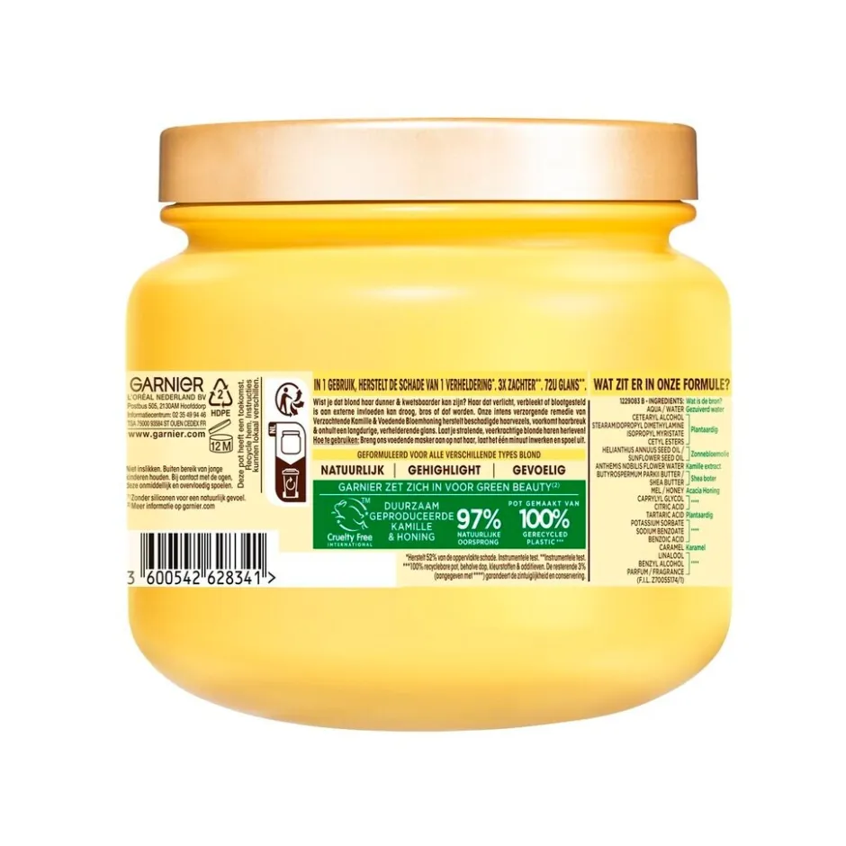 Het Garnier Loving Blends Blond Remedy Herstellend Masker bevat 97% ingrediënten van natuurlijke oorsprong. De pot is gemaakt van 100% gerecycled plastic***.