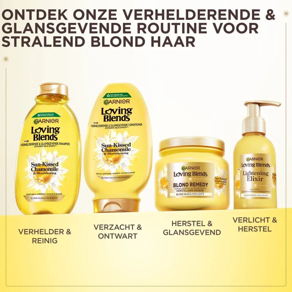 Het Garnier Loving Blends Blond Remedy Sun-Kissed Chamomile & Bloemenhoning Herstellend Masker herstelt je haar, verheldert en geeft het glans.