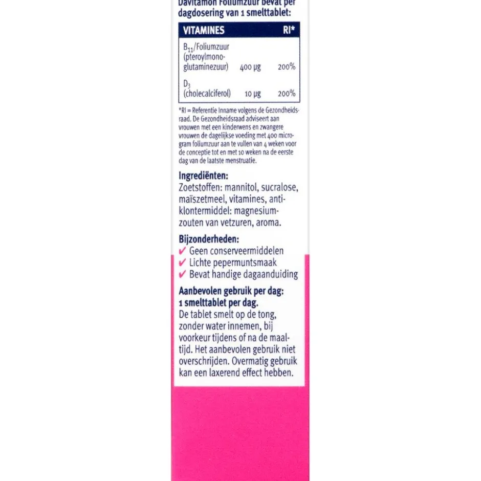 400 mcg Foliumzuur bij kinderwens en zwangerschap, Extra vitamine D3, smelttabletten.