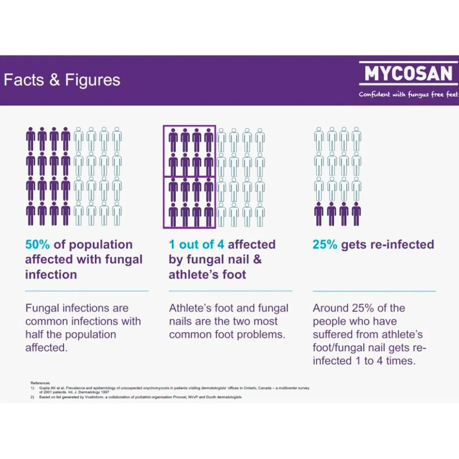 • Bij lichte vormen van kalknagels. Mycosan behandelt en voorkomt beperkte oppervlakkige schimmels aan vinger- en/of teennagels.