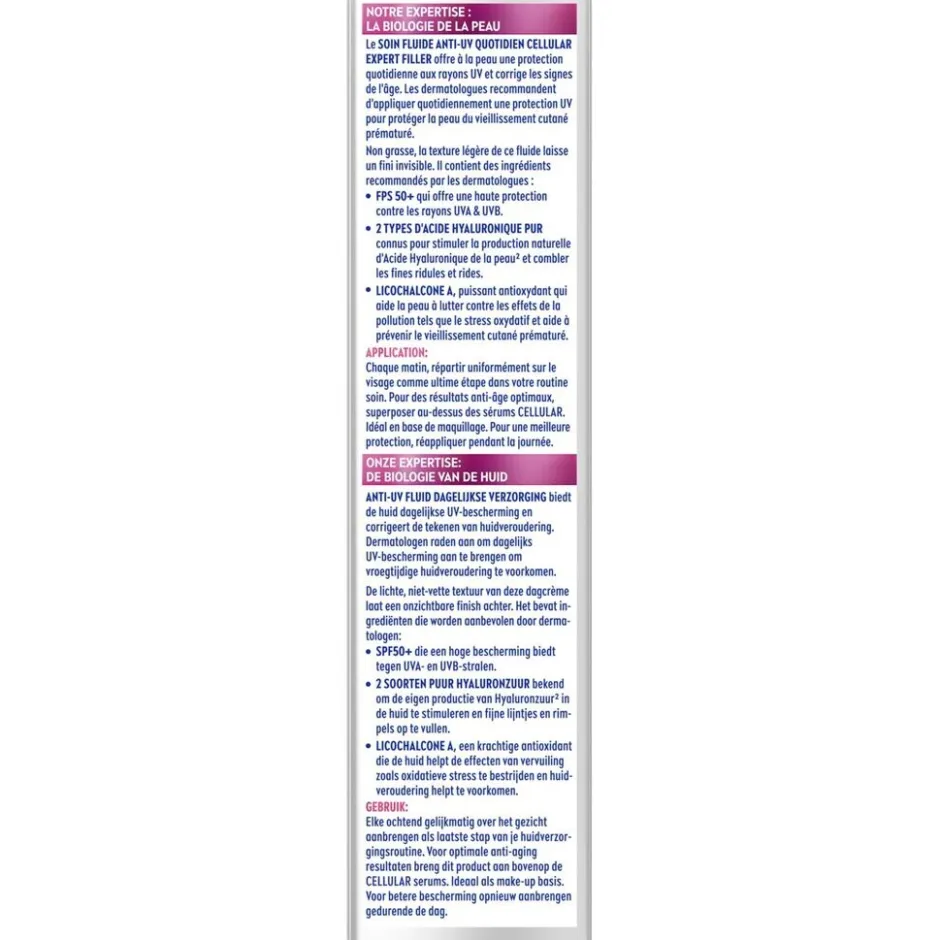 De NIVEA Cellular Expert Filler Anti-Uv Daily Fluid biedt een doeltreffende bescherming tegen dagelijkse uv-straling en helpt tekenen van huidveroudering te verminderen. Twee soorten puur hyaluronzuur stimuleren de natuurlijke productie van hyaluron in je huid en vullen fijne lijntjes en rimpels van binnenuit op. Licochalcone A, een krachtige antioxidant die werkt tegen de effecten van vervuiling zoals oxidatieve stress, helpt vroegtijdige huidveroudering te voorkomen.