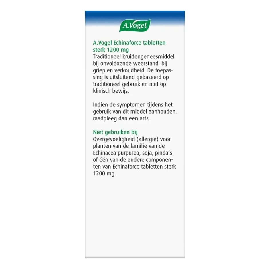 A.Vogel Echinaforce Sterk 1200mg Tabletten is een traditioneel kruidengeneesmiddel dat gebruikt wordt bij onvoldoende weerstand, bij griep en verkoudheid.