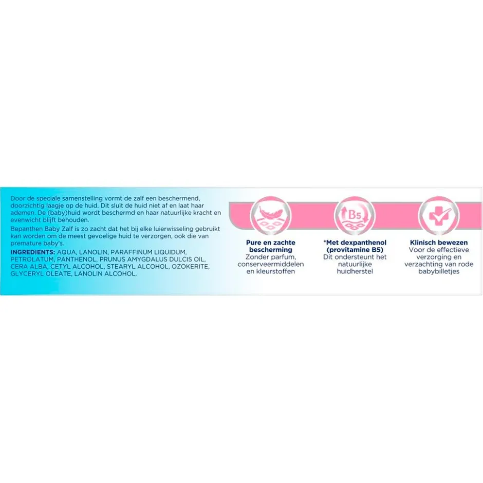 Bepanthen Baby Zalf bevat een hoge concentratie dexpanthenol en ondersteunt het natuurlijke huidherstel. Door de speciale samenstelling vormt de zalf een beschermend laagje op de huid. Het doorzichtige laagje sluit de huid niet af en laat haar ademen. De babyhuid wordt beschermd en haar natuurlijke kracht en evenwicht blijft behouden. De zalf is zorgvuldig samengesteld en bevat geen kleurstoffen, conserveermiddelen of parfum.