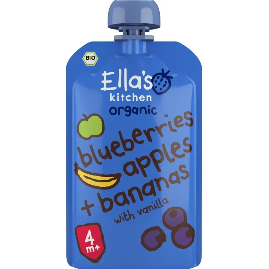Ella’s Kitchen 4+M Blauwe Bes Appel Banaan bevat 100% biologische gepureerde, bosbessen, appels, bananen en vanille, zonder toevoegingen, zelfs geen water. Geschikt voor kindjes vanaf 4 maanden.