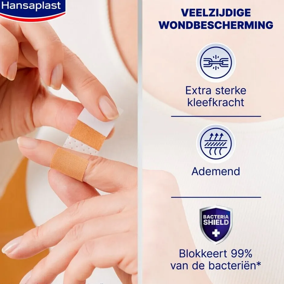 • Extra sterke hechting: de kleefkracht van deze Hansaplast pleister zorgt ervoor dat de pleister goed op zijn plaats blijft zitten