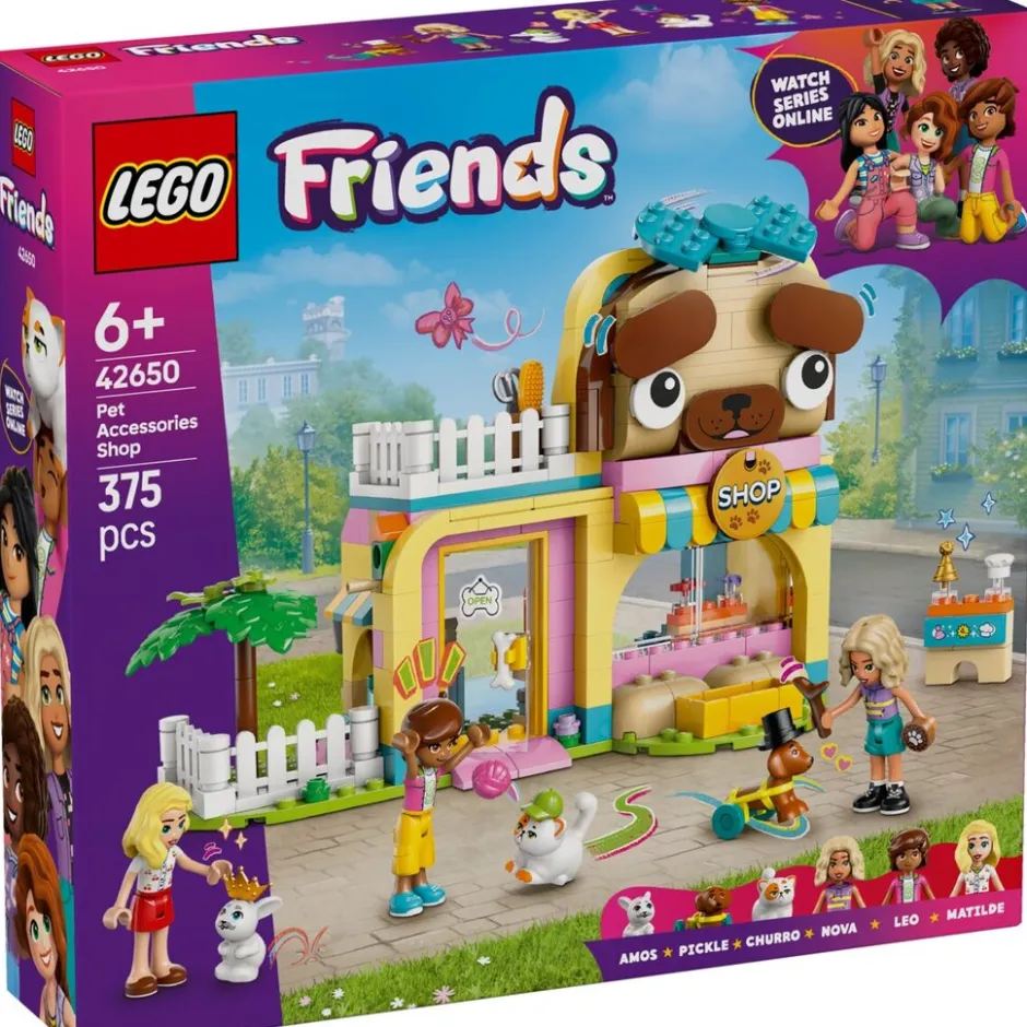 Speel urenlang met de LEGO Friends 42650 Winkel met Dierenaccessoires. Speel met de drie poppetjes en figuren van een kat, hond en konijn.