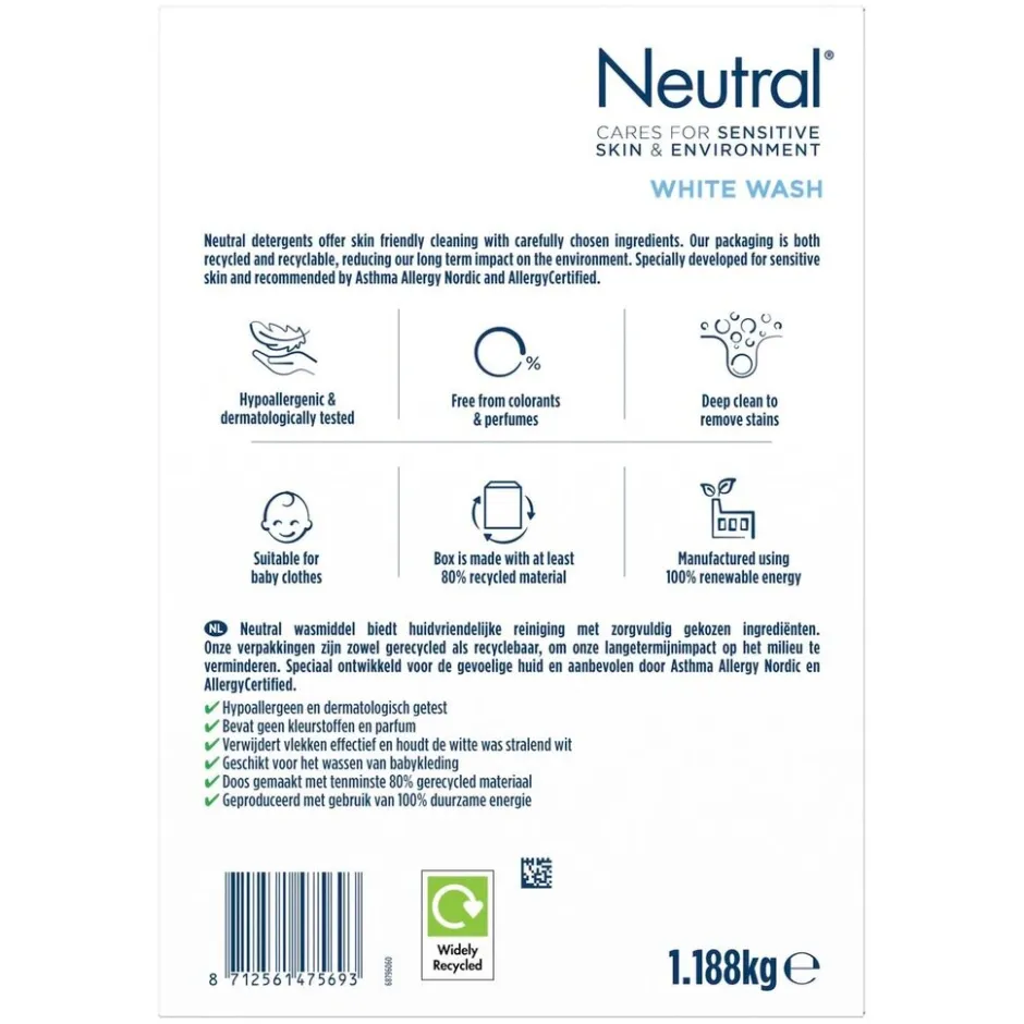 Neutral is mild en hierdoor geschikt voor alle huidtypen en leeftijden! Neutral Parfumvrij Wit Waspoeder wordt geproduceerd met behulp van 100% duurzame energie en de doos is gemaakt van minstens 80% gerecycled materiaal.