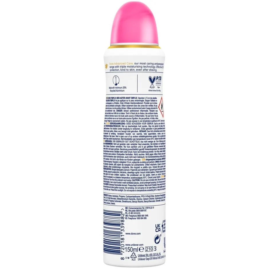 • Deze Dove Advanced Care Antitranspirant maakt deel uit van de meest verzorgende lijn van Dove, met de gepatenteerde formule zijn ze zacht voor je huid, zelfs na het scheren