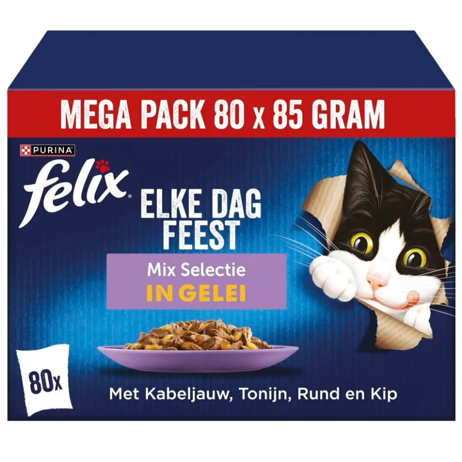 Het is zo fijn om een kat te zijn! Vooral tijdens de maaltijden, als je kat Purina Felix Elke Dag Feest Mix Selectie in Gelei Kattenvoer krijgt.