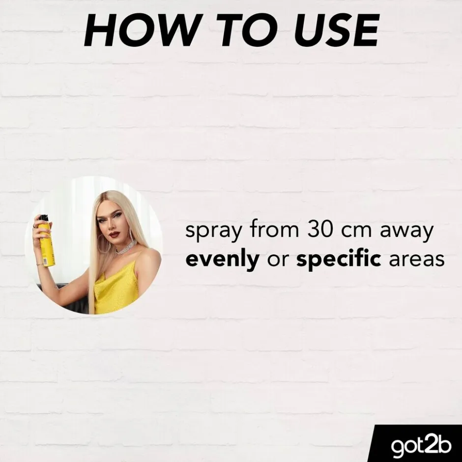 • Voor totale fixatie, spray je gelijkmatig over je haar vanaf 30cm.