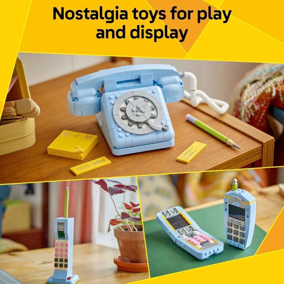 Deze indrukwekkende LEGO vintage telefoon set biedt drie verschillende bouwmogelijkheden met dezelfde LEGO stenen: een retro telefoon uit de jaren 1960, een telefoon met een oplaadstation uit de jaren 1980 of twee coole telefoons uit de jaren 2000. Let op: de modellen kunnen niet tegelijkertijd worden gebouwd.