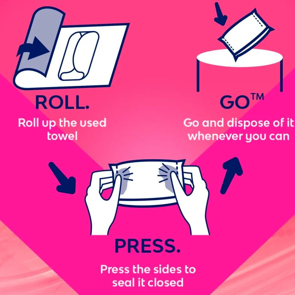 Het maandverband is voorzien van het Roll.Press.Go-systeem. Je kunt het maandverbandje makkelijk, hygiënisch, discreet en geurloos afsluiten en weggooien. Het maandverband is ongeparfumeerd.