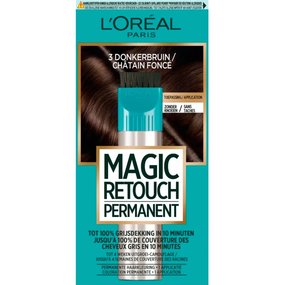 L’Oréal Paris Magic Retouch 3 Donkerbruin Permanente Haarkleuring biedt een snelle oplossing tussen haarkleuringen. Binnen tien minuten dekt deze permanente haarkleuring tot 100% van je grijze haren.