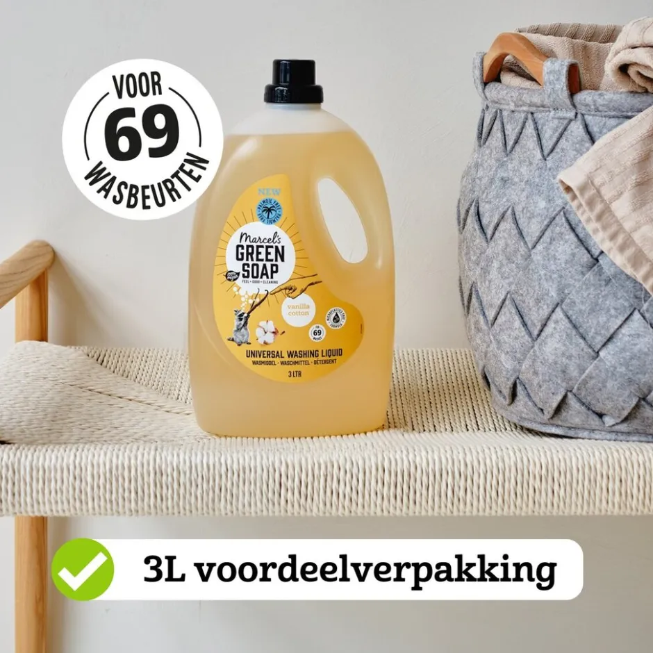 Marcel’s Green Soap Vanille & Katoen Vloeibaar Wasmiddel laat je kleding en beddengoed heerlijk ruiken! De formule is vegan, palmolievrij en voor 97% biologisch afbreekbaar.