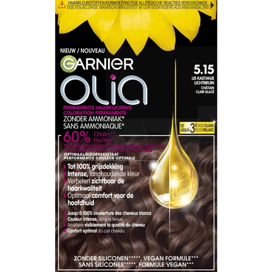 Garnier Olia 5.15 Ijs Kastanje Lichtbruin Permanente Haarkleuring is een permanente haarkleuring op basis van oliën en biedt tot 100% grijsdekking zonder ammoniak, voor een aangename geur.