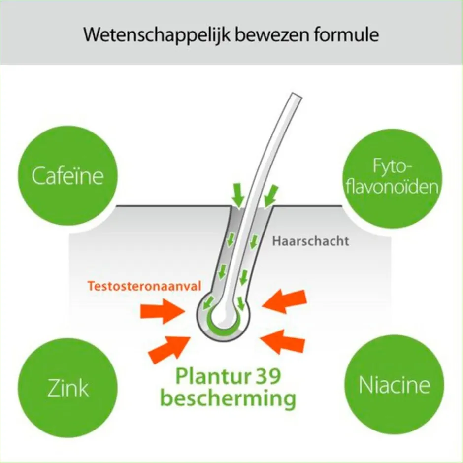 Plantur 39 bevat het Phyto-Cafeïnecomplex, dat je haarwortels tegen hormoongevoelige uitputting beschermt. Het voorkomt dat testosteron de haarwortels beschadigt en zo de energievoorziening aantast.