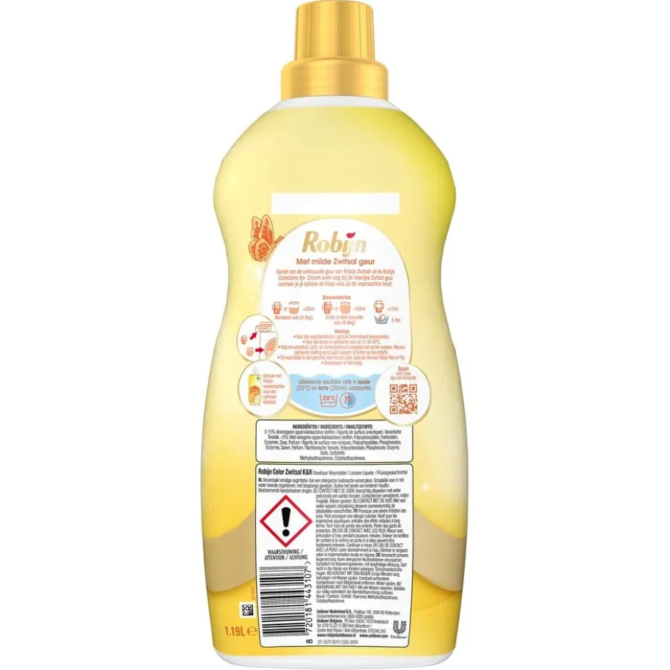 Robijn Collections Klein & Krachtig Zwitsal Color Vloeibaar Wasmiddel heeft een unieke formule die speciaal is ontwikkeld voor de bonte en gekleurde was. Het wasmiddel geeft je wasgoed een heerlijk frisse Zwitsalgeur.