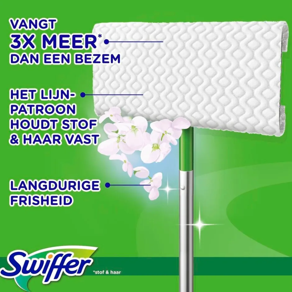Swiffer is perfect om fijn stof op te vangen in kleine hoekjes of moeilijk bereikbare plekken, zoals onder de bank en het bed waar bezems en stofzuigers niet altijd komen. Dankzij de dikte en het specifieke patroon van de stofdoekjes en hun antistatische werking, vangt en houdt het doekje al het stof vast en zorgt voor een langdurige frisheid. Met Swiffer Clean & Fresh Droge Vloerdoekjes gaat schoonmaken sneller en gemakkelijker dan ooit!