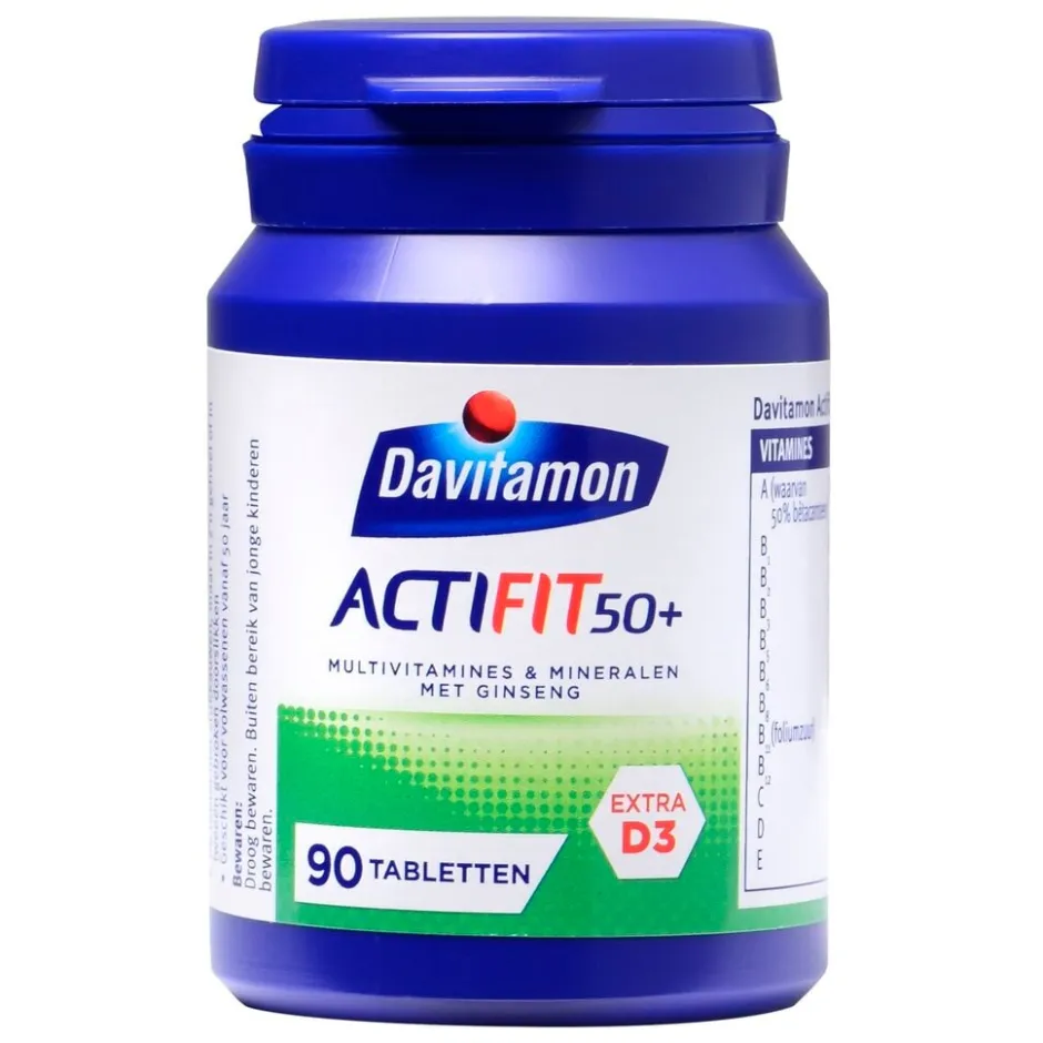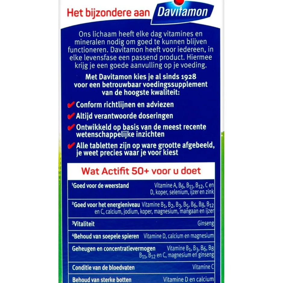 Davitamon Actifit 50+ Tabletten zijn speciaal ontwikkeld voor volwassenen vanaf 50 jaar en voorziet in de dagelijkse aanvulling van belangrijke vitamines en mineralen, aangevuld met het natuurlijke plantenextract ginseng.