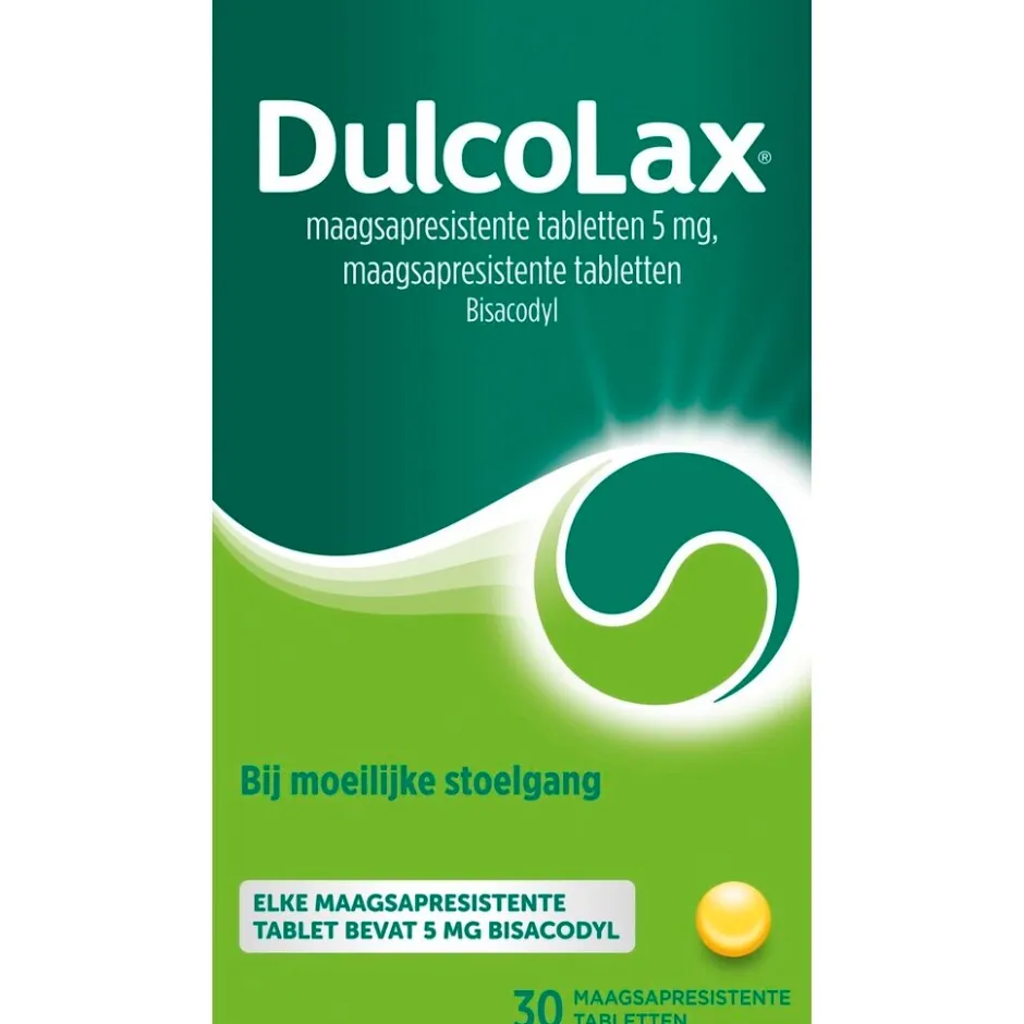 Dulcolax 5mg Tabletten bij moeilijke stoelgang. Dulcolax maagsapresistente tabletten bevatten 5 mg bisacodyl per tablet. De verpakking bevat 30 maagsapresistente tabletten.