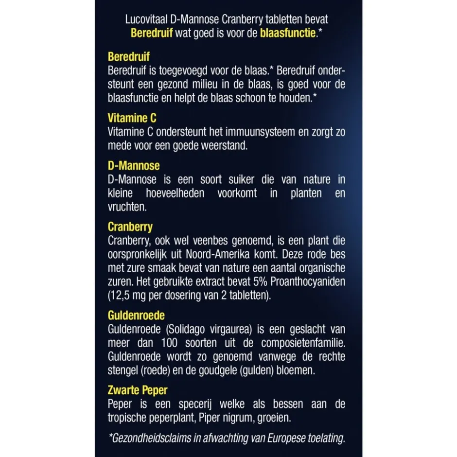 Lucovitaal D-Mannose Cranberry Tabletten bevatten beredruif dat goed is voor de blaasfunctie en helpt de blaas schoon te houden.