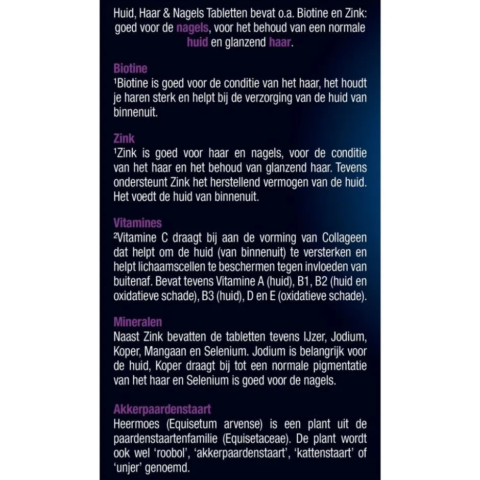 Bevat geen zout. Geen suikers toegevoegd;Glanzend haar¹, sterke nagels¹ encollageenvorming in de huid² ¹Biotine is goedvoor de conditie van het haar, het houdt jeharen sterk en helpt bij de verzorging van dehuid van binnenuit.;¹Zink is goed voor haar en nagels, voor deconditie van het haar en het behoud vanglanzend haar. Tevens ondersteunt Zink dehuid;²Vitamine C draagt bij aan de vorming vanCollageen dat helpt de huid te versterken enhelpt lichaamscellen te beschermen tegeninvloeden. Bevat tevens Vitamine A (huid),B1, B2 (huid, antioxidant), B3 (huid), D en E(antioxidant);Jodium ondersteunt de huid, Koper draagt bijtot een normale pigmentatie van het haar enSelenium is goed voor de nagels.