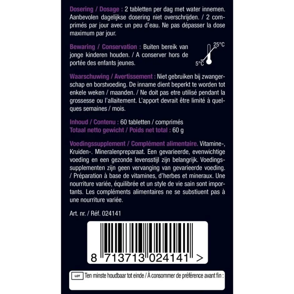 Naast zink bevatten de tabletten ijzer, jodium, koper, mangaan en selenium. Jodium ondersteunt je huid, koper draagt bij tot een normale pigmentatie van je haar en selenium is goed voor je nagels.