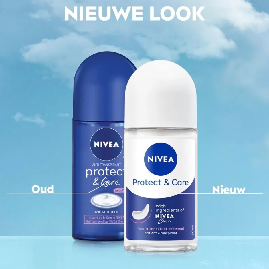 De NIVEA Protect & Care Antitranspirant Roller biedt 48 uur effectieve bescherming tegen transpiratie, gecombineerd met de milde verzorging van originele NIVEA Creme-ingrediënten.